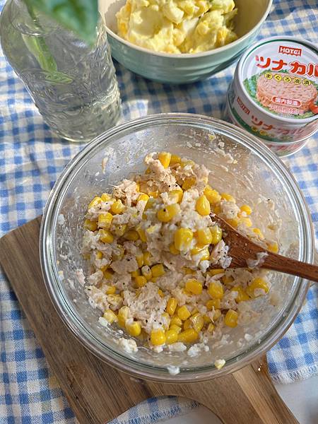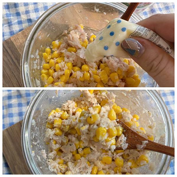 步驟3:把洋蔥跟鮪魚結合後再加入玉米粒跟沙拉醬