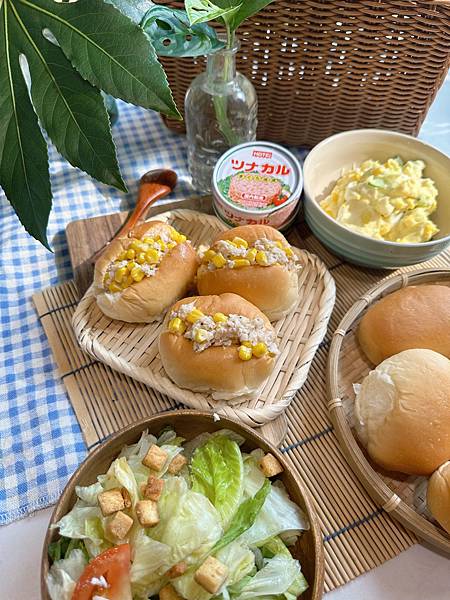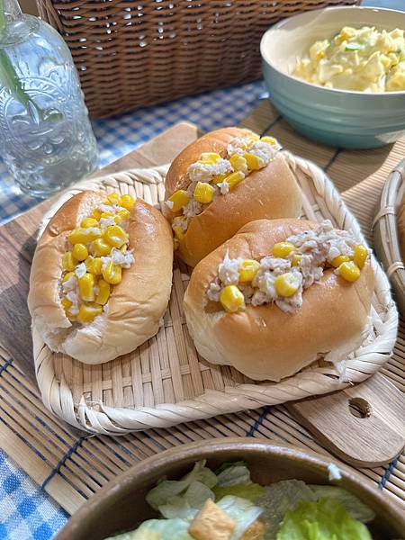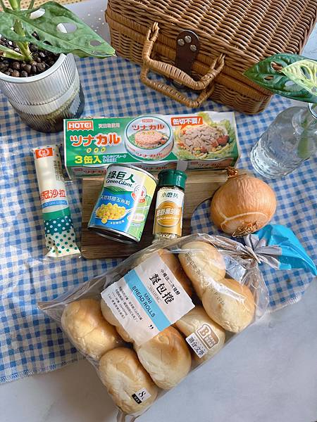 準備食材:鮪魚罐頭1、洋蔥1/4、玉米罐頭1/2、黑胡椒粉、沙拉醬與餐包
