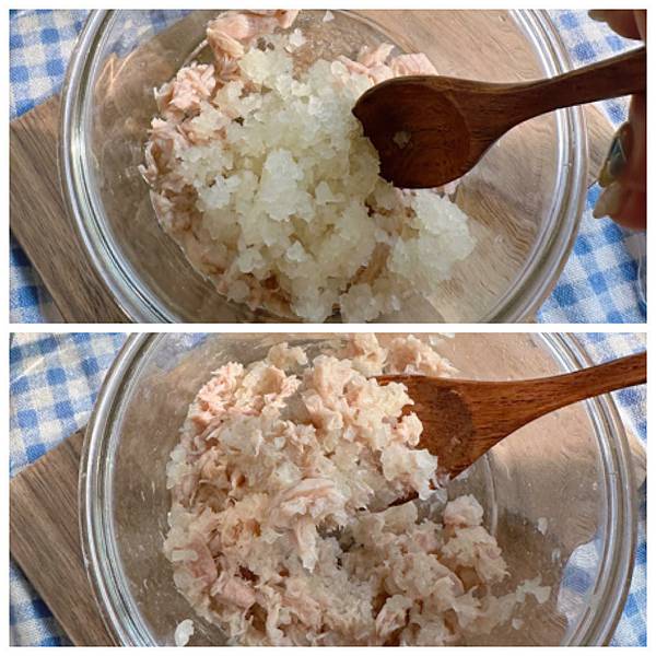 ★小秘訣:要跟洋蔥攪拌前先把罐頭的油漬在瀝乾一點